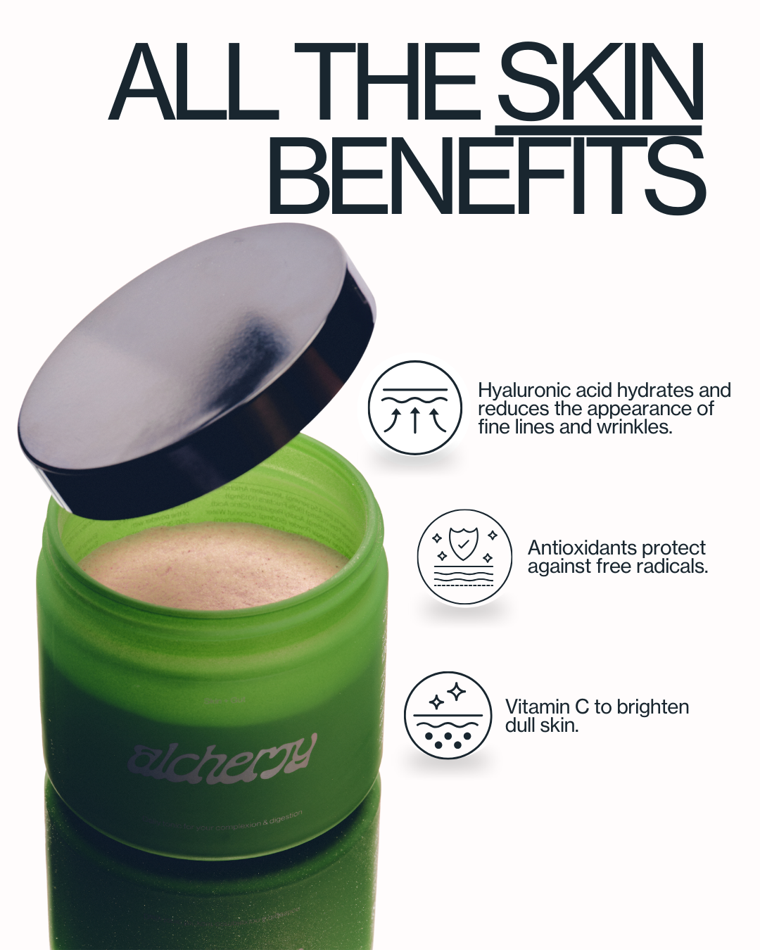 Skin enhancing ingredients: Coconut Water Powder, Amla Berry Fruit Powder, Grape Seed 4:1 Extract, Acerola Cherry Fruit Juice Extract, Hyaluronic Acid (Sodium Hyaluronate)